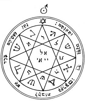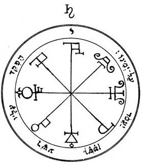 Примечание Мазерса. [Этот Пентакль] сформирован из Тайных Знаков Сатурна. Вокруг него написано на иврите: "Предназначен для управления злом, и пусть Сатана станет по правую руку от него".