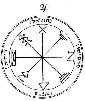 Примечание Мазерса. Над Магическим Символом - Имя IH, Иах (Iah). Под ним - Имена Ангелов Адониэля (Adoniel) и Бариэля (Bariel), буквы последнего имени окружают квадрат, разделенный на четыре части. По кругу - стих из Псалма CXI, 3 "Обилие и богатство в его доме, и правда его пребывает вовек".