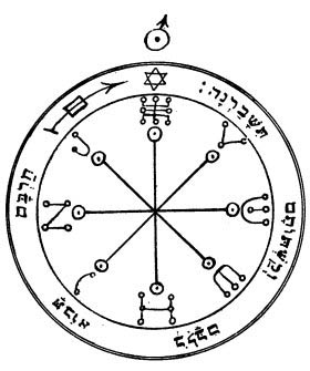 Примечание Мазерса. Это Тайная Фигура Соломона. - Она существует только в двух манускриптах (Lansdowne 1202 и 1203). Ее приводят Элифас Леви в своей работе "Учение и ритуал Высшей магии" и Тихо Браге в своем "Calendarium Naturale Magicum", но в обоих случаях, - без еврейских слов и букв. Вероятно, потому, что искажения неграмотных переписчиков сделали их неузнаваемыми. После большой работы и изучения фигуры, я полагаю, что слова в "теле" символа относятся к Десяти Сфирот, выстроенным в форме Древа Жизни, с Именем Соломона, начертанным справа и слева, в то время как знаки, расположенные по кругу, - это двадцать две буквы еврейского алфавита. Таким образом, я восстановил их. Именно в таком виде данная фигура приведена на фронтисписе рукописи.