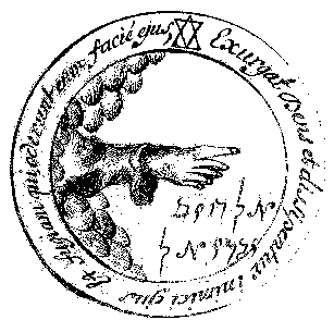 Примечание Мазерса. Рука, указующая на Имя Эл (El) и на Ангела Абариэля (Abariel). Стих взят из Псалма LV, 12 "На Бога (Elohim) уповаю, не боюсь, что сделает мне человек?"